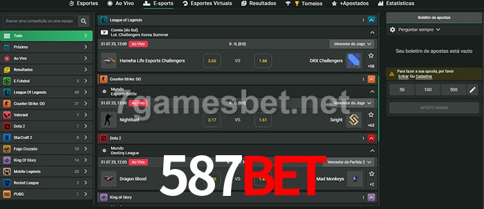 O 587bet oferece uma grande seleção de opções de apostas em e-sports com probabilidades competitivas